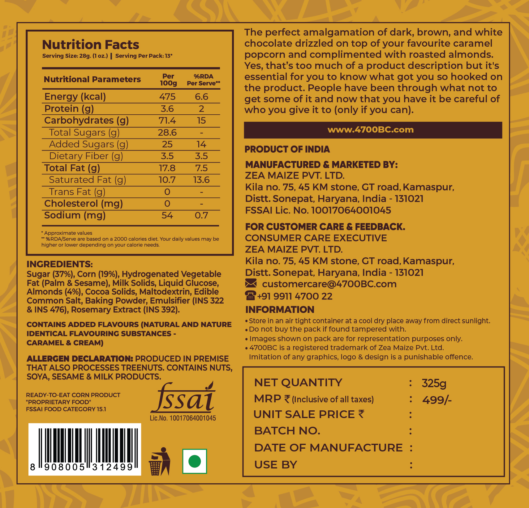 Indulge in 4700BC Gourmet Popcorn coated with milk, white and dark chocolate, balanced with crunchy almonds. Packed in an exquisite, contemporary and extremely durable tin that can be reused for endless purposes. A perfect snack for chocolate lovers!